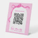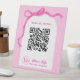 Qris payment tabletop sign for wedding organizer/planner business features pink ribbon and white wedding gate.