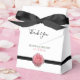 This design features an elegant pink rose flower. The floral pink rose combined with the elegant black ribbon image create a sophisticated simple border framing the text. The pink tones of the rose flower contrast against the black ribbon and wording creating a chic elegant style. Elegant wedding favour box design with modern elements. Matching wedding invitations and other stationery items are also available.