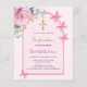 A blush pink background with an arch. Decorated with a pink floral, rose flower, green watercolored eucalyptus greenery and butterflies. Personalise and add a name and details.