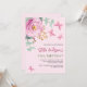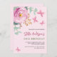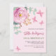 A light pink background. Decorated with a pink rose and green watercolored eucalyptus greenery and butterflies. Personalise and add your name and party details.