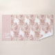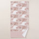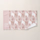 This custom bath towel set features a luxurious floral watercolor design. The pattern features blush pink roses accented with rose gold glitter over a white background. The bottom portion of each towel features a pink banner with a sample monogram initial followed by a name printed in an elegant script font. You can personalise the towel set to include your own custom name and monogram initial.