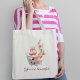 A pretty personalised floral tote bag features illustrated pink rose, with elegant customisable text on a pastel white background. Leaf, and buds. Botanic composition, a branch of flowers - abstraction roses, romantic flower, rose, floral, red, vintage.