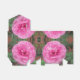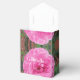 For lovers of the colour pink - The pattern on this tent style Favour Box with ribbon was made from an original photograph by HomeWare of a beautiful pink garden rose. The flower is open wide, with all of its petals in ruffled layers. The pink colour becomes deeper in the centre of this lush bloom. The photo of the flower, with its surrounding green leaves and earth, has been repeated to form this original design. Thus the background of the roses looks a bit like an Oriental rug in soft shades of greens and earth tones. There is text in white which is set for you to personalise or delete if you prefer.