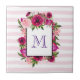 Monogrammed ceramic tile with a floral bouquet composed of light pink roses and dark pink poppies with lots of lush green leaves. A frame layered over top to put your personalised monogram letter inside. The background is a soft pastel pink striped pattern.