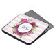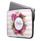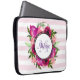 Personalised laptop sleeve with a name and monogram initial. Designed with a floral bouquet composed of light pink roses and dark pink poppies with lots of lush green leaves. A frame layered over top to put your personalised text inside. The background is a soft pastel pink striped pattern.