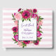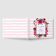 A wedding guest book with a floral bouquet composed of light pink roses and dark pink poppies with lots of lush green leaves. A frame layered over top to put your personalised text inside. The background is a soft pastel pink striped pattern.