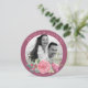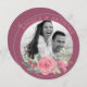 Pretty pink watercolor rose bouquet wreath photo wedding save the date announcement card (round). This photo wedding save the date announcement card is lovely for a spring or summer wedding. Watercolor pink rose with greenery and other flowers. Personalised with your names and your engagement photo. Additional wording on the back.