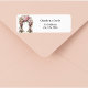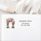 A white background. Decorated with a romantic garden arch with pink and white florals, roses. Personalise and add your name and address. Black letters.
