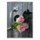 A thank you card featuring a photo of a small bouquet of three light pink roses and greenery wrapped with burlap twine resting in the handle of a barn door. White text on front says "Thank You." Inside is blank. This card can also be purchased in smaller notecard size. Look for matching wedding invitations and more at Jill's Paperie.