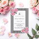 Classic slim black and white stripes as background. With romantic pink roses, and the the Eiffel Tower as decoration. A black and white frame with templates for your party information.