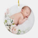 Pink Roses Greenery Foliage Girl Baptism ornament. This design features an illustration of pale pink roses and leafy green stems in watercolor style. On the top of the poster there is an image of a Cross. Personalise with your own words - you can use this tags for Christenings, Holy Communions, or Confirmations. On the reverse side - there is a baby photo.