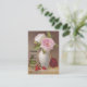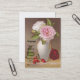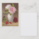 Light pink roses in a white vase. A red rose and rose hips sit on the table in this victorian trade card from the 1800s.