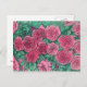 Postcard featuring delicate floral art, blooming rose flowers in a garden. Pink, rose, mint and emerald green colours.