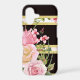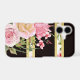 This phone case features a stunning image of pink watercolor roses at the left bottom. The rose bouquet is placed on a striped background. The stripes are black and gold, with a matching stripe rose pattern interspersed among them. Very unique, pretty, and definitely an attention grabber!