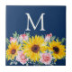Pink Roses Sunflowers Navy Blue Monogrammed Ceramic Tile