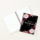 Modern Romantic Roses Personalised Name Sketchbook featuring elegant pink and red rose corner borders on a white frame and black background. The custom script typography name template can be personalised with an artists name. To add more text or change the font style / colour press the customise further button.