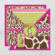 Safari prints, giraffe, zebra, and cheetah and a polka dot pattern, with monkey hanging on a vine and 3D look tags, bows, trims fifth birthday invitation card.