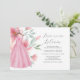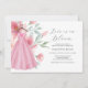 Celebrate the bride-to-be with these elegant pink bridal shower invitations online, featuring a charming watercolor dress surrounded by delicate florals in soft pink and sage blue. The phrase "Love is in Bloom" is styled in modern script typography, adding a romantic touch perfect for spring or garden parties.