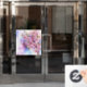 Artistically drawn, branch of pink, cherry blossoms on picturesque, textured background, painted over with white, pink and blue paint. Pink Sakura