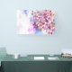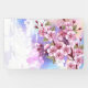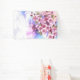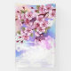 Artistically drawn, branch of pink, cherry blossoms on picturesque, textured background, painted over with white, pink and blue paint. Pink Sakura