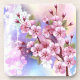 Artistically drawn, branch of pink, cherry blossoms on picturesque, textured background, painted over with white, pink and blue paint. Pink Sakura