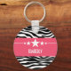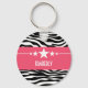 Trendy and modern Sassy Star Zebra Keychain featuring a chic black and white zebra print background and a bold magenta border adorned with a fun star motif. This girly design may be customised with the personalised text of your choosing. Click "Customise It" to find more personalisation options.