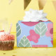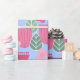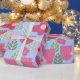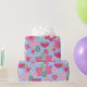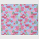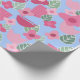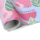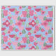 This wrapping paper has a Scandinavian design of flowers and leaves in various shades of pink and green on a field of blue.