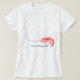 Pink shrimp t-shirt with black custom text. A single shrimp with long, swirling antennae is the design for tees, sweatshirts, or any apparel. A line of black printed text beneath can be used for any wording, in as many lines as are needed - still fitting the design. Advertise a business, personalise with a name, or remove the text to buy blank.