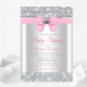 Pink and silver baby shower invitation with pretty pink and silver diamond bow on an elegant diamond bling background. This pink and grey bling baby shower invitation is easily customised for your event.