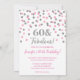 Custom 60th Birthday party invitations in a pink and silver glitter confetti pattern. Add your name and party details for a unique and stylish 60 and fabulous party invitation.