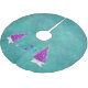 This tree skirt is teal with two shiny pink and silver trees on a white star with the text Merry Christmas in colourful festive letters on a teal background.