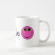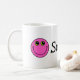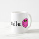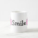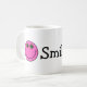 This mug features a pink smiling emoji face on each end and the word "Smile" in the centre.