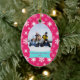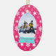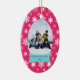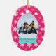 This oval shaped Christmas holiday ceramic ornament has a stylish hot pink background with lots of trendy white snowflakes all around in the background. In the middle, you can customise the family photograph with your own. Below the photo, there is an aqua blue and white banner where you can personalise the family name and year. You could customise the text for a Baby's First Christmas or even an Our First Christmas for a newly married couple!