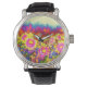 I had two concerns when ordering this watch - one that the watchband didn't look that glittery and two that the dial would be too large. Neither was a problem at all. The watch band is nice and glittery for a touch of bling. As to the size, I have small bones so I tend to like smaller looking accessories and I am quite comfortable with this. Neither too large or too small. The outside edge to edge on the dial is 1 1/4" the inside image is 1 inch.