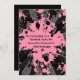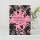 Cute paintball birthday party invitations with pink and black paint splatters on a grungy grey, black, and pink sunburst patterned background. You can personalise these for any occasion.