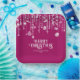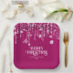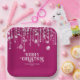 Pink and white string lights sparkles Christmas party paper plates with a cute whimsical fun party invitation for a festive Holiday party.
