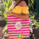 Feel the tropical breezes with this cute beach bag tote which can be personalised with any initial and name or names for a great gift. Coordinates with the Pink Striped Flamingo Monogrammed Beach Towel.