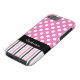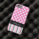 Stylish iPhone 6 case, with a pink and white polka dot pattern, on the top and a dark grey, pink and white striped pattern, on the bottom. A black band runs across the case between the two pattern, with white custom script text ready to personalise. Pretty way to protect your iPhone 6 and look stylish too, and makes a great personalised gift idea.