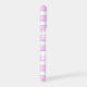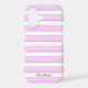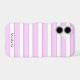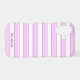 A custom phone case with a block letters on a background of pink stripes in light pink, dark pink and white.
