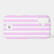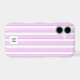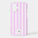 A monogram phone case with a block letters on a background of pink stripes in light pink, dark pink and white.