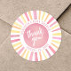This round sticker design features a vibrant sun with a soft pink centre, with the cheerful phrase "Thank You!" placed right on top. The sun's rays shine in warm shades of yellow, orange, pink, and red, adding a bright and joyful touch to your baby shower.