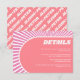 This Details enclosure card for a wedding brings a splash of 70's vibes with its bold pink and white colour scheme and groovy sunrays. Its unique arch design on the front of the card is accompanied by the text "DETAILS" written in a vintage font, adding a bit of nostalgia to the card. Furthermore, the names of the newlyweds are featured on the back of the card, printed in a diagonal pattern in pink and white, making this card perfect to be used as an announcement for the special day.