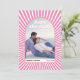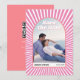 This Save the Date card has a colourful 70's-inspired look with its bright pink and white colour palette and groovy sunrays. This card has a unique arch-shaped design and photo on the front, with your custom text in a retro font. The back of the card has a QR code that leads to the wedding website for more information.