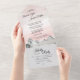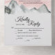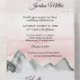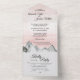 This Pink Sunrise Mountain wedding all in one wedding invitation brings a classy and unique, yet simple and casual touch to your wedding. The sunrise and sunset shades of pink, mauve, peach, blush, coral and dusty rose, kissed with starry gold glitter around the styled calligraphy text brings a peaceful, minimal nature to the watercolor painted grey mountains for a mountain themed marriage celebration.