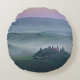 Round throw pillow with a foggy sunrise with a pink sky and mist between the Tuscan hills over agriturismo podere il Belvedere farmhouse in the Valdorcia (Orcia Valley) between Pienza and San Quirico in Tuscany, Italy.
