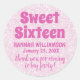 Rosy pink text on soft textured pink background. Sweet Sixteen is written in a bold pink text. Your name and birthday are written in a simple deep pink font. Thank you for coming to my party is in the same pink, but it looks lighter, because it's a cute script font. Sweet pink way to thank your guests for sharing your day with you.