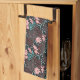 Towel with an elegant pattern made with pink flowers, teal leaves, and red berries on a dark background.