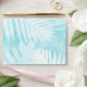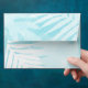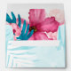 A tropical envelope with pink hibiscus, tropical ginger, and gumdrop flowers. Beautiful teal island leaves and pink watercolor design is complete with coordinated rsvp enclosure cards, thank you cards, and mailing accessories.