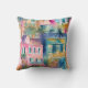 Decorator throw pillow with a colourful painting of cute pink, teal, and yellow watercolor houses and tropical palm trees.