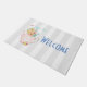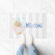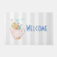 Welcome doormat with a whimsical illustration. A pink teapot with a little pink heart in the centre and a bouquet of flowers inside. Delicate pastel coloured butterflies fluttering about. Set on a grey and white striped background.